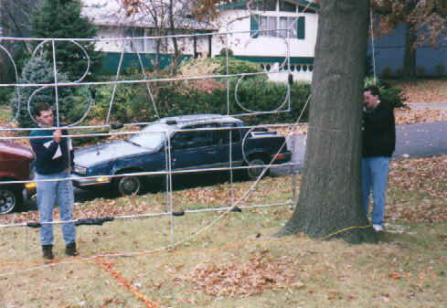 Here is a picture of my brother and I putting the final touches on setup (I'm on the right). Note the conduit frame and the rope attaching the sign to the tree. Also note the black wads on the conduit. Those are the extra lights from each light string in the display (each letter is a separate light string). The extra lights were grouped together in a ball and stuffed into a black plastic trash bag. Then the bag had black electrical tape wrapped around it. Also note the extension cords on the ground. I grouped them all together and ran them back into the house.