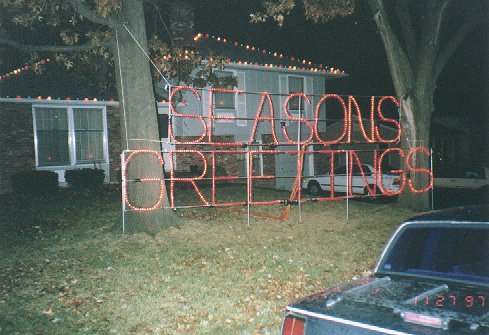 With the word "SEASONS" turned on, channels 1-7 are on and channels 8-16 ("GREETINGS") are off. Also note the lights on the roof - those were such a pain to put up that I've left them up all year. I measured the distance between each one (10") to make sure they looked neat and tidy: