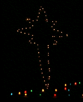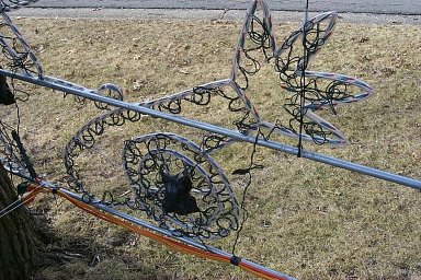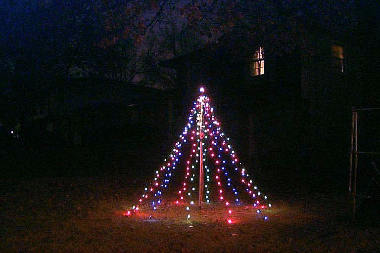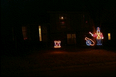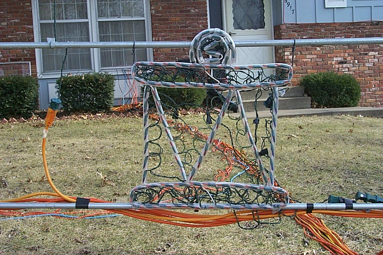Here are links to pictures of the display during the day so you can see more details. One can see that I use clear plastic tubing with solid copper wire in it to form my displays. I make cuts in the tubing every 1.5" to insert the lights. Check out the picture of the cannonball/snowball to see what I mean.