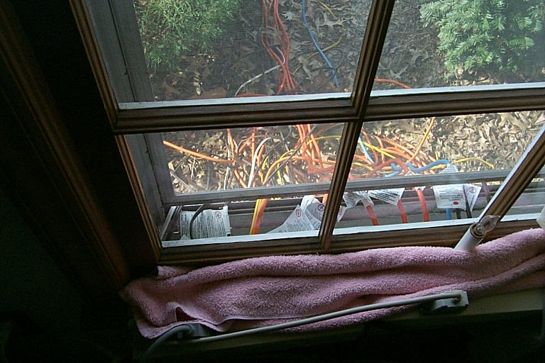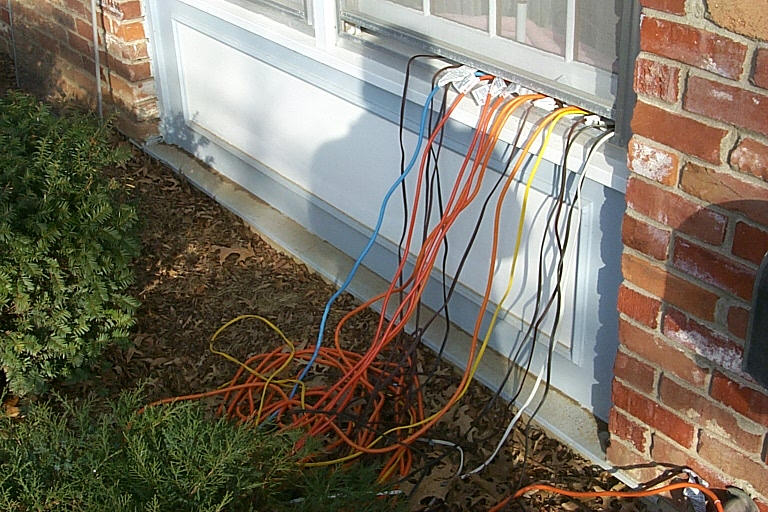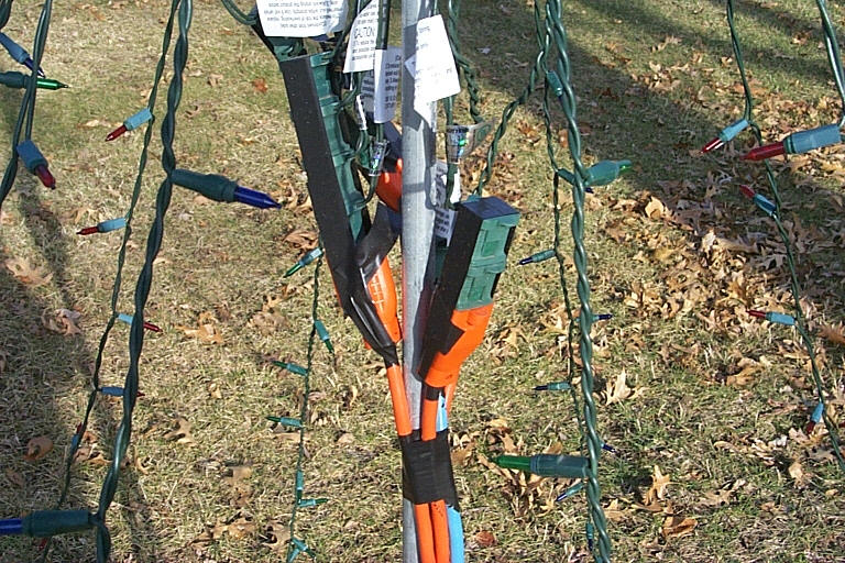 And here are some pictures of the computer that controlled the display and all of the cords that ran from the house to the display. The computer was nothing more than a 486 with no hard drive, a 3.5" floppy drive, and two printer port cards in it. The timer (visible in the pictures) would turn the computer on and the computer would boot from the floppy (DOS 6.22) and then run my DOS-based program. Each printer port controlled 8 circuits. In these pictures you can see the two cables going from the computer to the two control boxes.