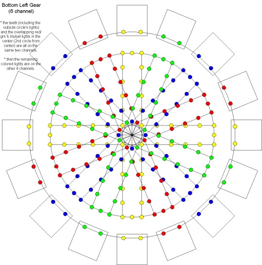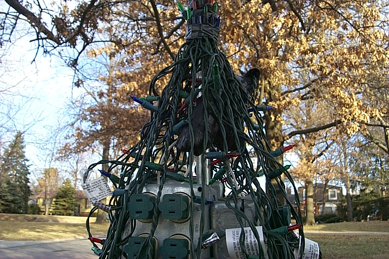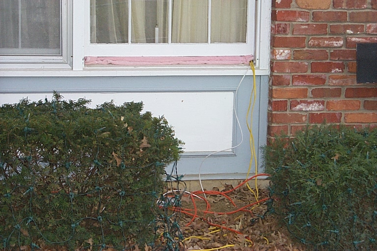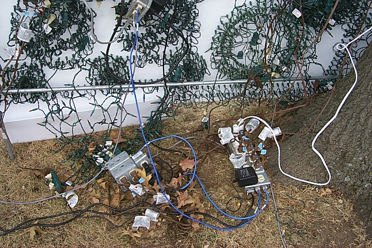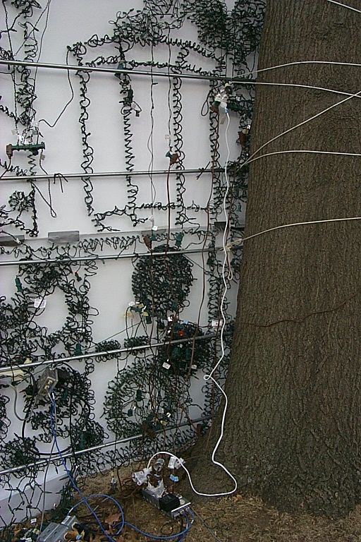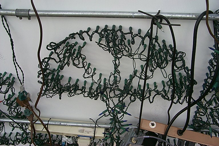 The path the data cable took was out the front window to the 3 boxes located at the top of the Christmas tree. From there it went to the 5 control boxes that controlled the gift wrapping machine.